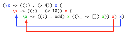 ((:) . (> 4)) <*> (((:) . (< 10)) <*> (((:) . odd) <*> (pure [])))